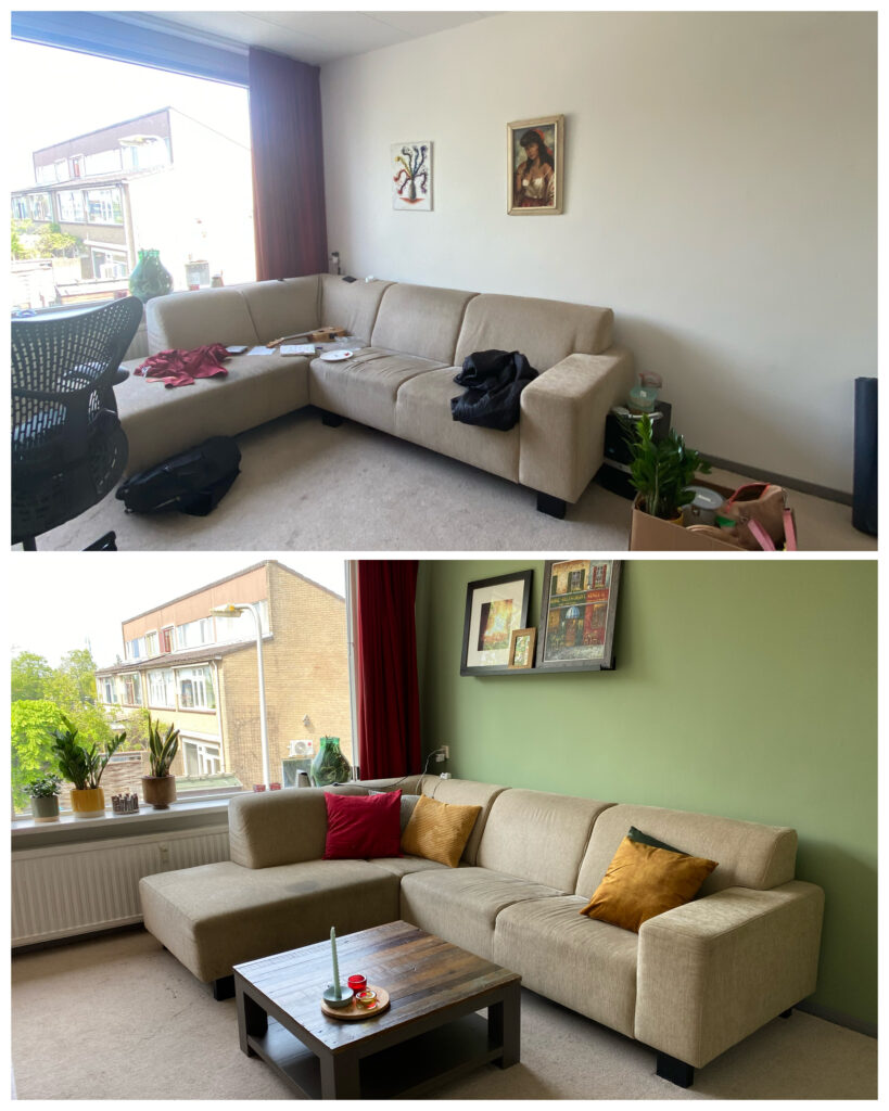 “Ik had eerder een styliste ingeschakeld, en die had heel veel mooie ideeën. Helaas bleef het bij mooie ideeën en jaren later zat ik nog steeds in een vrijgezellenhuis. Met hulp van Thirza heb ik eindelijk een keuze kunnen maken in wat ik wil en heeft ze zelfs deze nuchtere man accessoires aangesmeerd. Wat erg hielp, was dat waar we op uit kwamen ontzettend betaalbaar was. Ze had zelfs een tafel voor me meegenomen uit de kringloop. Bij het verven en monteren was ze flink van het aanpakken en daardoor waren we in 1 middagje klaar. Check de foto’s, dat is best top, toch?”